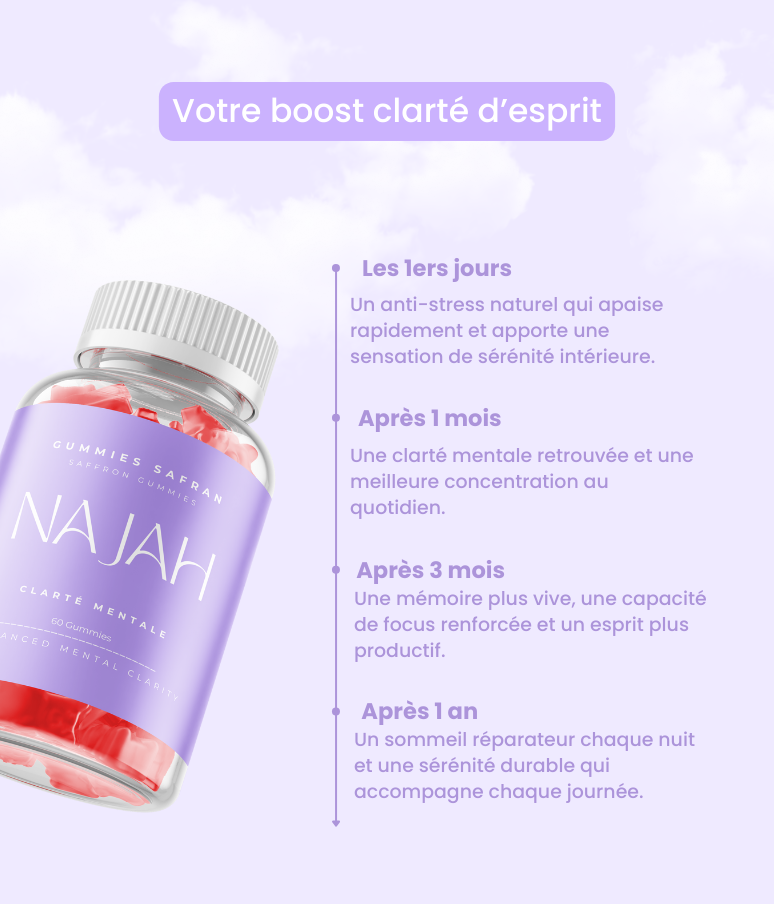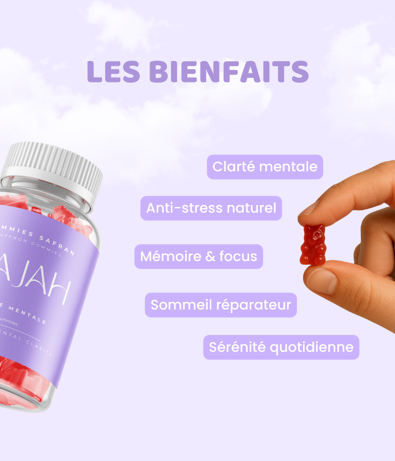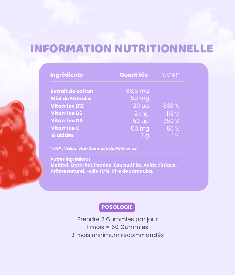 Our Saffron Gummies help promote serenity and emotional well-being . Thanks to their high saffron content (88.5 mg), they help reduce stress , improve sleep quality , support concentration and maintain emotional balance on a daily basis.